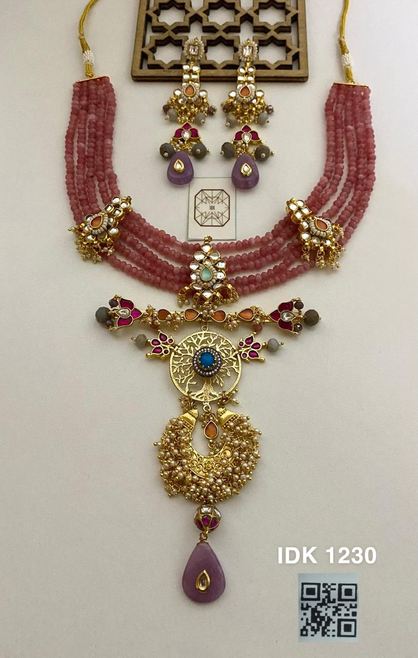 A striking handcrafted necklace set featuring layered rose-toned bead strands, intricate kundan accents, and a symbolic tree-of-life inspired pendant with ornate gold detailing. Finished with elegant drop elements, this piece is perfect for festive evenings, weddings, and statement ethnic ensembles.