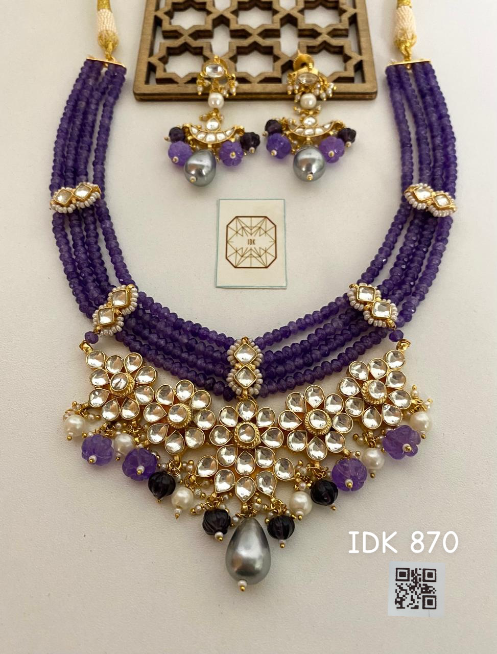 A striking handcrafted necklace set featuring layered amethyst-toned bead strands paired with floral kundan motifs and pearl accents. Finished with a bold central drop and matching earrings, this piece blends elegance with depth, making it ideal for festive evenings, wedding guests, and statement ethnic looks.