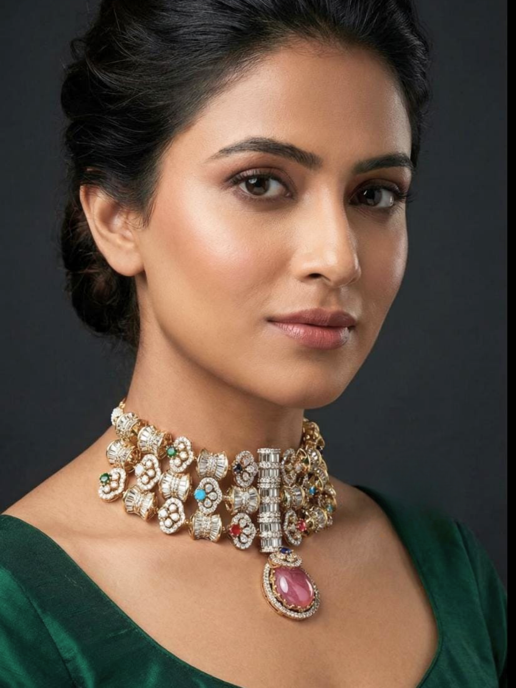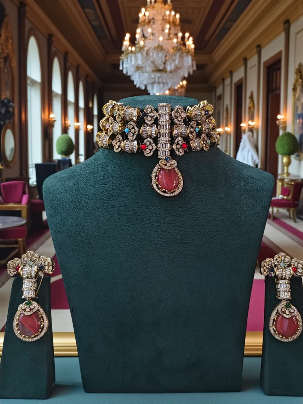 An opulent choker necklace inspired by royal heirloom jewellery, featuring a deep ruby-toned central drop framed with intricate kundan craftsmanship. The richly detailed gold-finish base is accentuated with delicate stone clusters and subtle multicoloured highlights, creating a majestic balance of tradition and grandeur. Paired with matching statement earrings, this set is designed for brides and celebratory occasions that demand timeless elegance and unmistakable presence.