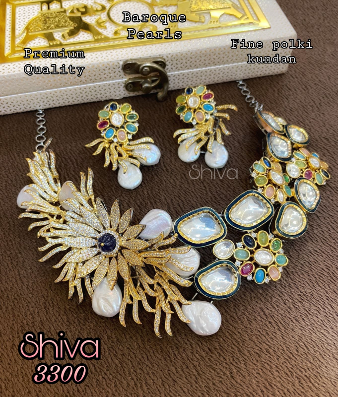 An opulent statement necklace set that celebrates baroque elegance and fine polki craftsmanship. Designed with luminous baroque pearls, intricately set polki kundan stones, and multicolour gemstone accents, this piece blends heritage artistry with a bold, contemporary silhouette. The dramatic floral-inspired centre motif paired with organic pearl drops creates a regal yet artistic appeal.