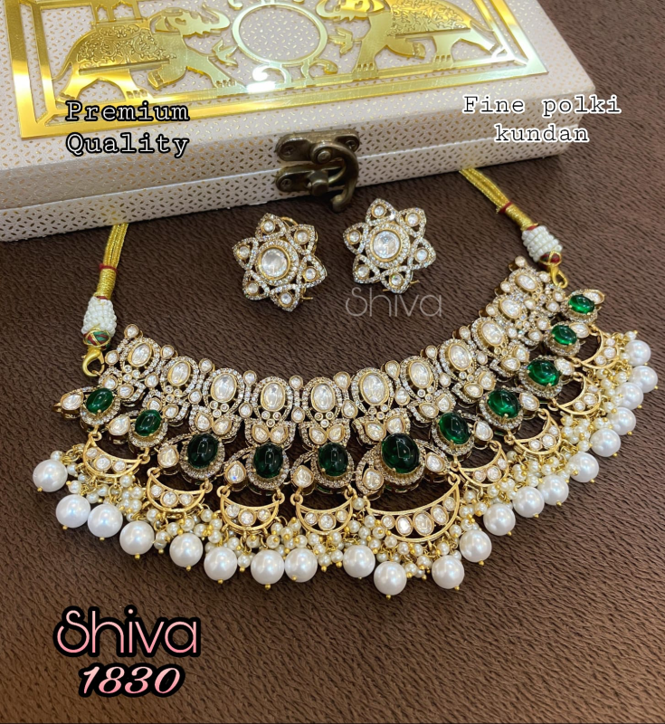 A timeless polki kundan choker set crafted to exude regal elegance. Featuring fine polki stones layered in intricate floral motifs, deep emerald-green accents, and finished with lush pearl drop detailing, this piece is a true celebration of traditional Indian craftsmanship. The rich gold-toned base enhances the brilliance of the stones, creating a balanced blend of opulence and refinement.