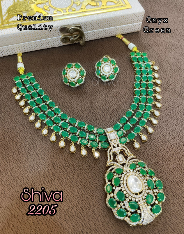 A regal necklace set crafted to make a powerful statement, the Emerald Noor Onyx Kundan Necklace Set features layers of rich onyx-green stones intricately set in a traditional kundan framework. The design is elevated with delicate teardrop polki accents and a bold central pendant that radiates old-world grandeur.