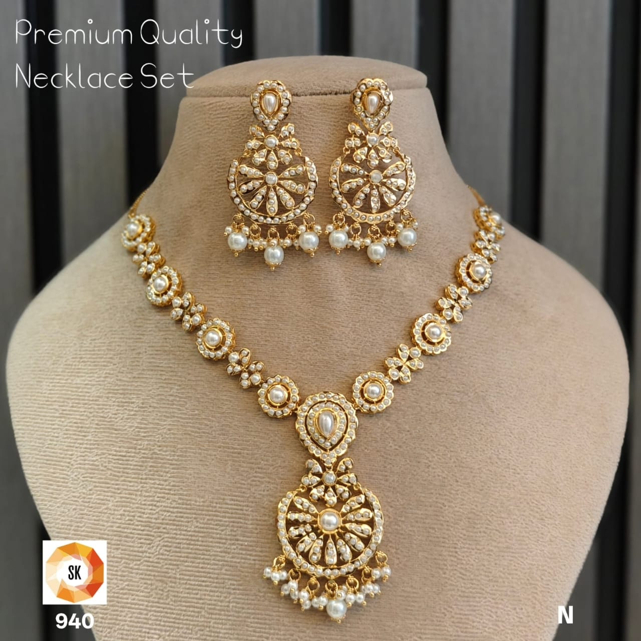 The matching earrings mirror the same circular motif design, finished with pearl drops that add graceful movement. Elegant, balanced, and richly detailed, this set is perfect for those who appreciate understated luxury rooted in classic Indian aesthetics.