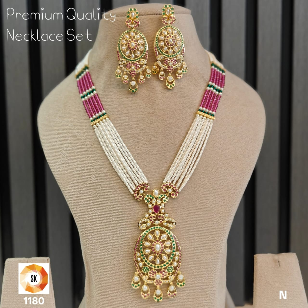 This Ruby–Emerald Pearl Strand Heritage Necklace Set is a celebration of traditional elegance and fine detailing. The necklace features layered white pearl strands, beautifully accented with ruby-pink bead sections and subtle green highlights along the neckline. The statement pendant showcases intricate kundan-style craftsmanship with ruby and emerald-toned stones arranged in a classic floral medallion, finished with delicate pearl drops for graceful movement.