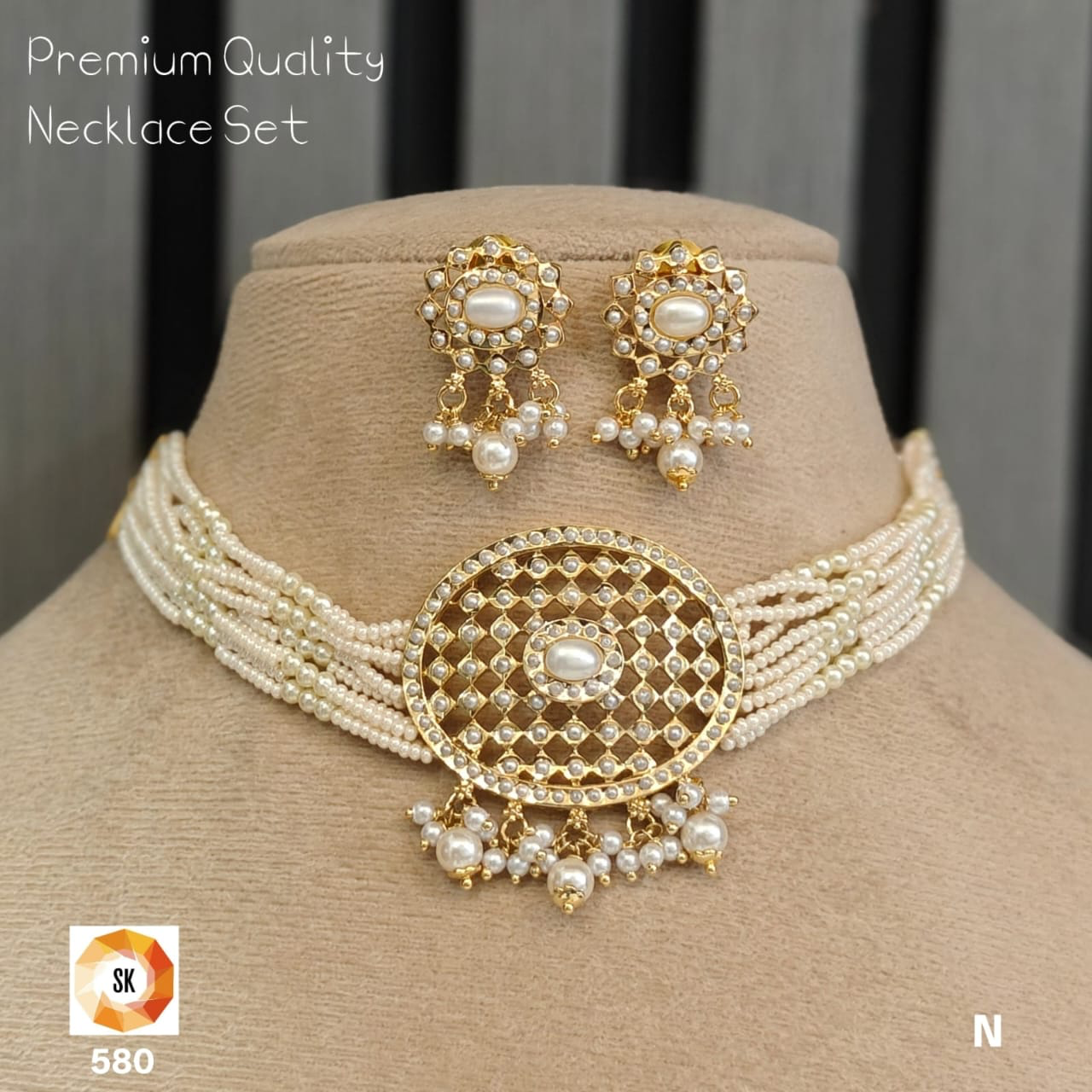 This Pearl Lattice Medallion Choker Necklace Set is a refined blend of classic elegance and traditional charm. The choker features multiple strands of delicate ivory pearls, beautifully centered with a round gold-tone medallion crafted in an intricate lattice pattern. The centerpiece is highlighted with a soft oval pearl at the core and finished with graceful pearl drops that add subtle movement and richness.