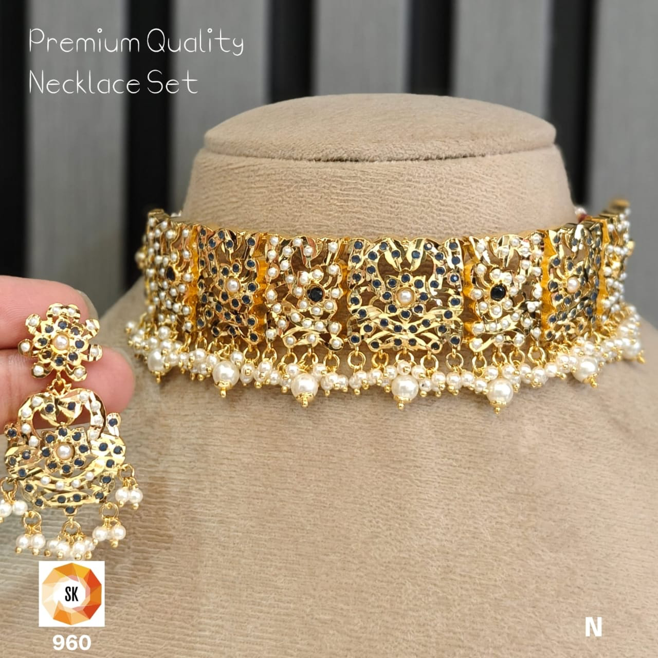The Midnight Bloom Pearl Choker Necklace Set is a bold and regal statement piece designed for grand occasions. This choker features intricately crafted floral motifs in a rich gold-tone finish, highlighted with deep navy-blue stones and delicate pearl accents. The structured choker design sits elegantly on the neckline, while the fine pearl drops along the base add softness and graceful movement.