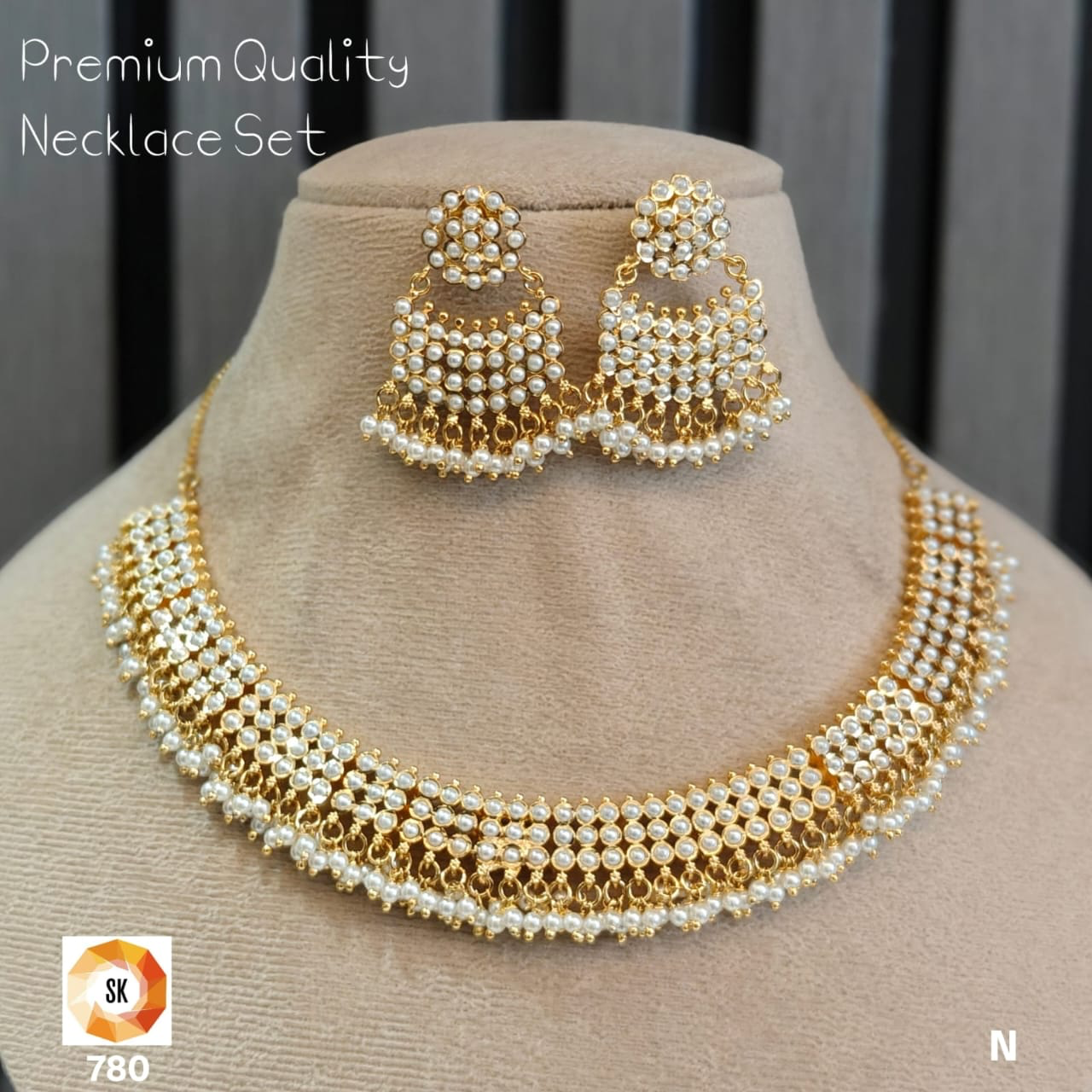 The matching earrings are designed in a structured yet graceful silhouette, with densely set pearls and subtle danglers that perfectly complement the necklace. This set strikes the perfect balance between traditional charm and refined sophistication.