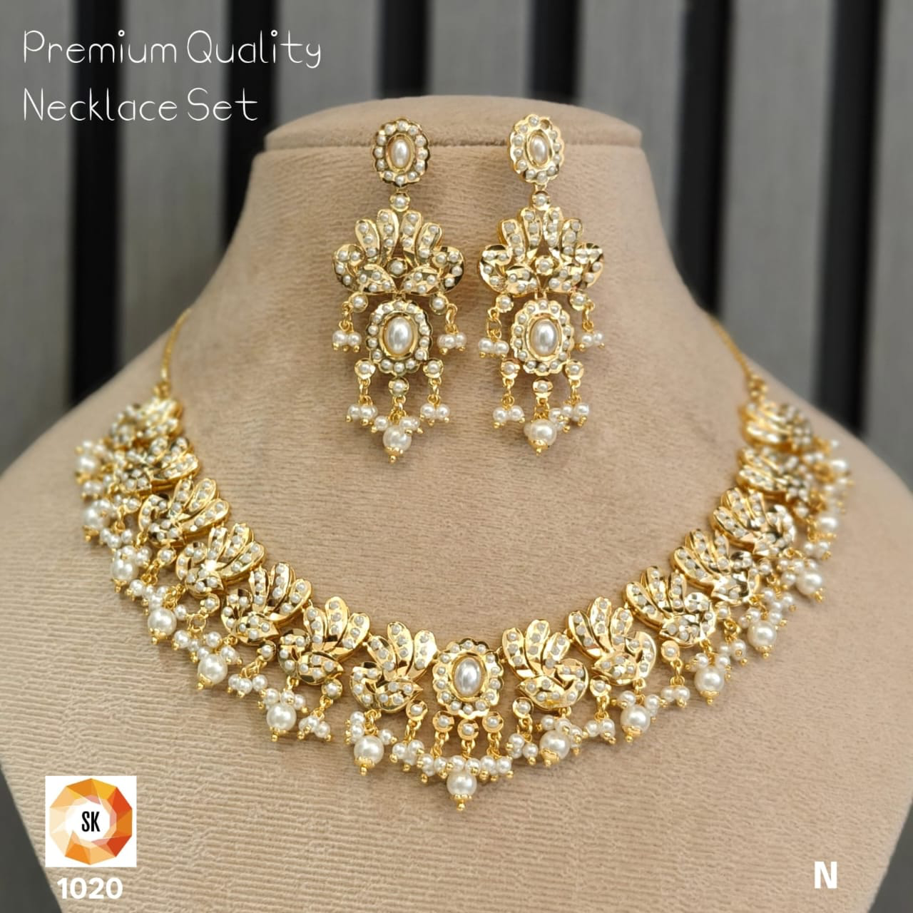 The matching earrings echo the same ornate craftsmanship, with structured motifs and pearl hangings that frame the face effortlessly. This set carries a classic bridal aura while remaining versatile enough for festive and formal occasions.