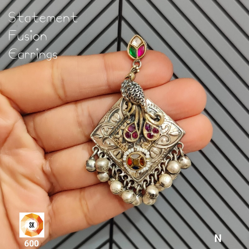 The Morni Heritage Fusion Earrings are a bold celebration of traditional Indian craftsmanship with a raw, contemporary soul. Crafted in an oxidised silver finish, the design features a beautifully sculpted peacock motif flowing into a diamond-shaped engraved base, rich with vintage detailing.