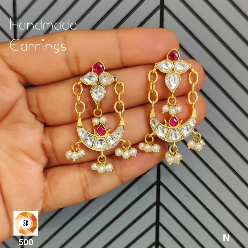 The Chandrika Pearl Crescent Handmade Earrings celebrate timeless Indian craftsmanship with a graceful, contemporary touch. Designed in a delicate crescent silhouette, these earrings feature hand-set kundan stones paired with rich ruby-toned accents that add a subtle pop of colour.