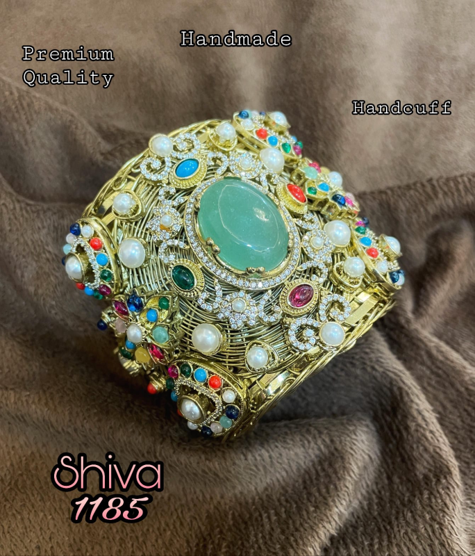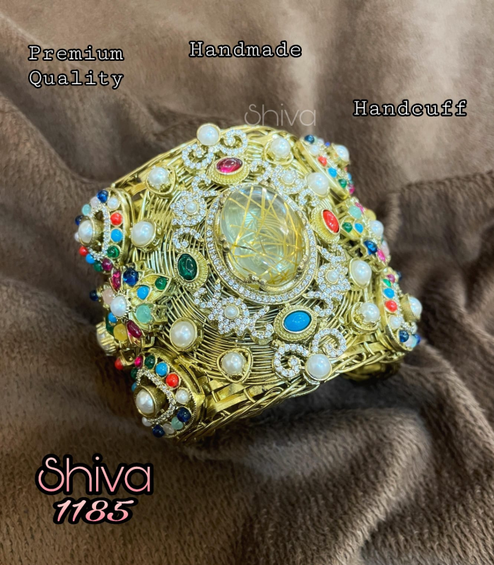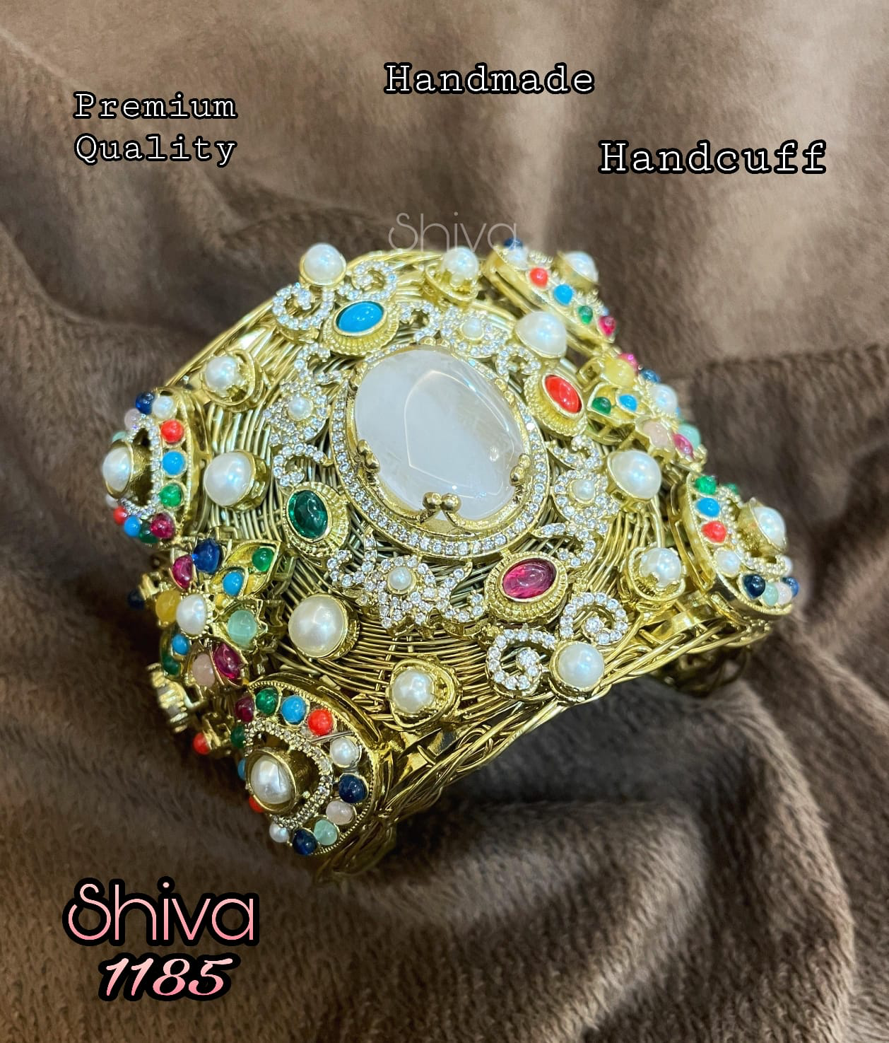 A bold, handcrafted statement handcuff featuring a striking rutilated quartz centerpiece, intricately wrapped in wirework and adorned with navratna-inspired multicoloured stones and luminous pearls. Designed to command attention, this sculptural piece blends heritage craftsmanship with opulent contemporary styling—perfect for bridal, couture, and luxury festive ensembles.