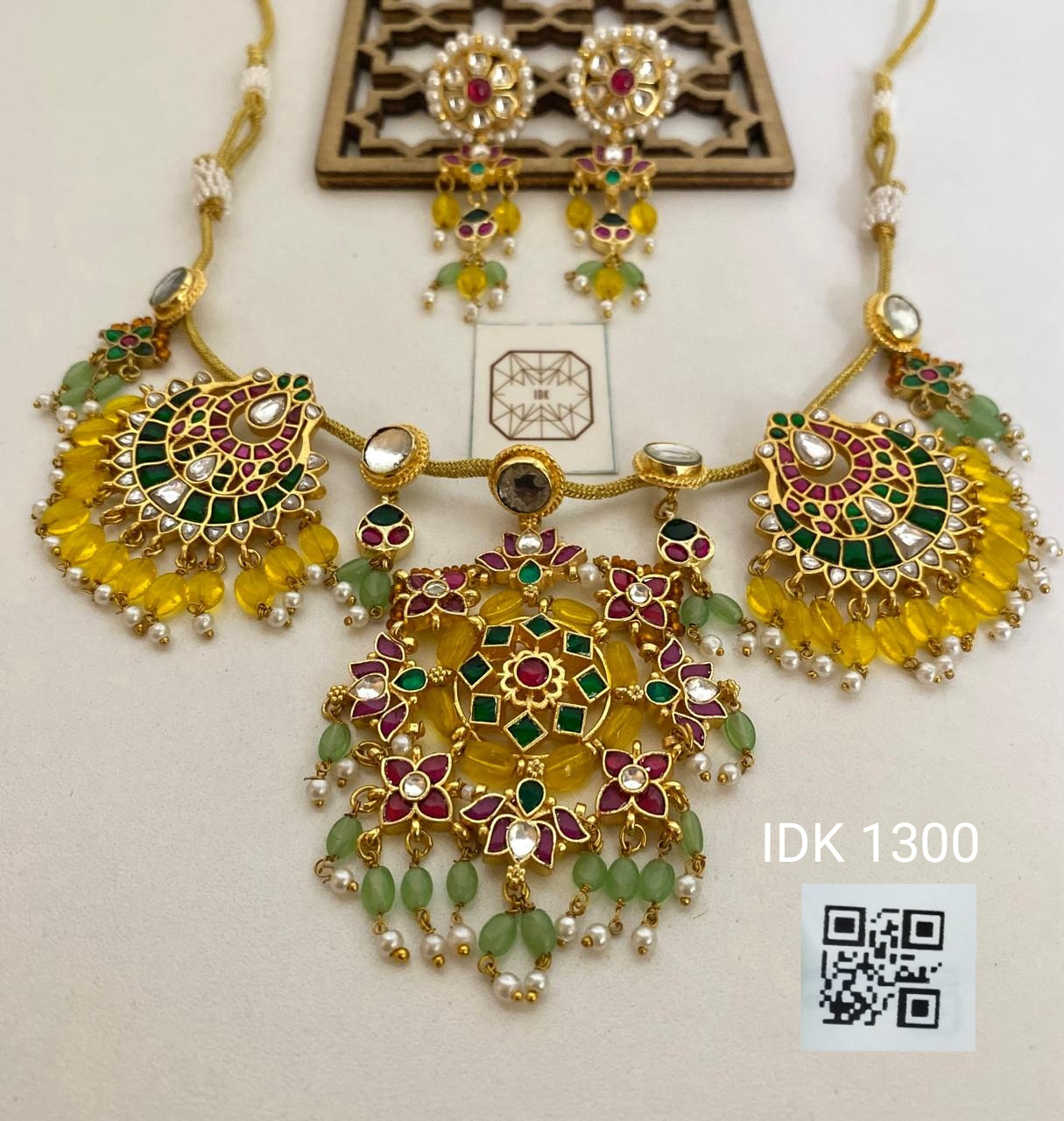 A richly detailed necklace set featuring traditional multicolour kundan work paired with bright yellow bead clusters and soft green accents. Finished with pearl drops and intricate floral motifs, this festive statement piece is perfect for weddings, haldi functions, and grand celebratory looks.