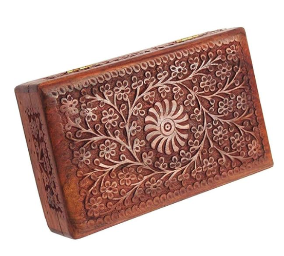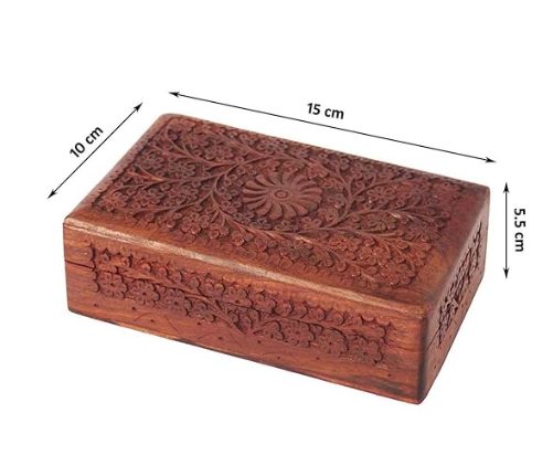This handcrafted wooden storage box features intricate floral carving inspired by traditional Indian craftsmanship. Made from solid wood, it is ideal for storing jewellery, keepsakes, or small essentials while adding a warm artisanal touch to your space.