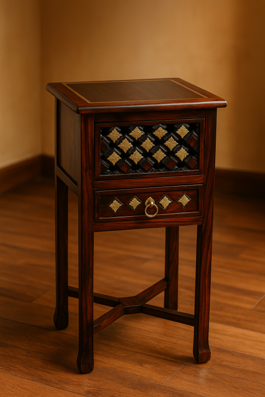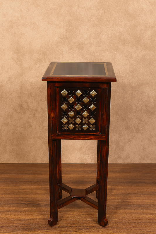 Featuring a spacious drawer with a brass ring handle and a decorative brass-inlaid panel above it, this piece is a perfect blend of traditional Indian artistry and modern utility. The sturdy cross-leg design ensures stability while enhancing its handcrafted appeal.