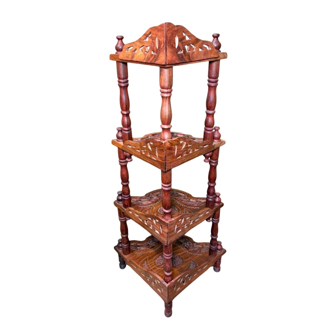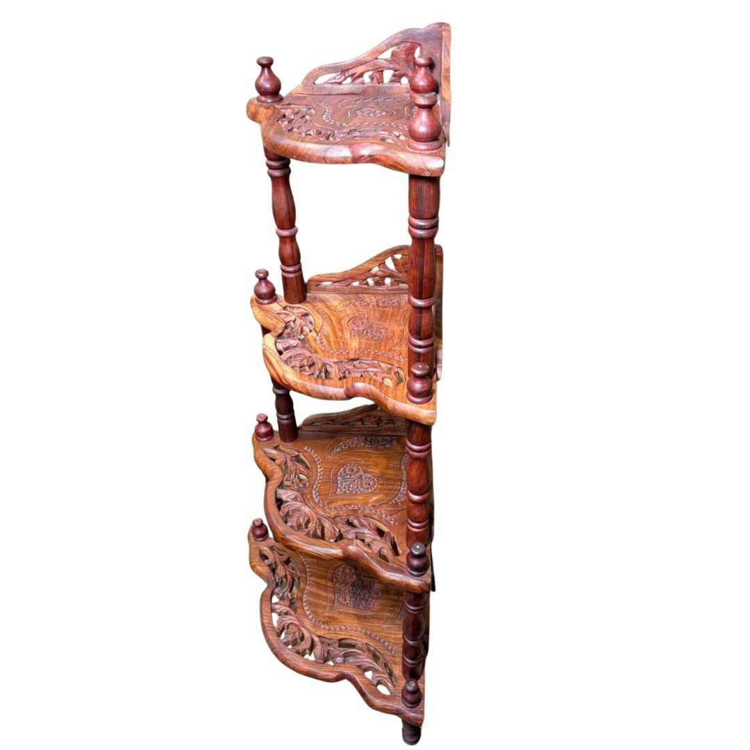 This handcrafted wooden corner shelf features intricate carving and a four-tier design, making it ideal for displaying décor accents, idols, or collectibles. Its compact corner-friendly structure adds traditional charm while saving space.
