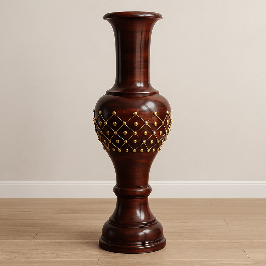 Enhance your space with the royal elegance of the Klaasy Handcrafted Wooden Floor Vase, a masterpiece of traditional Indian craftsmanship. Expertly made from premium sesame wood, this vase features a rich dark walnut finish that beautifully complements its detailed brass wirework and floral inlay design.