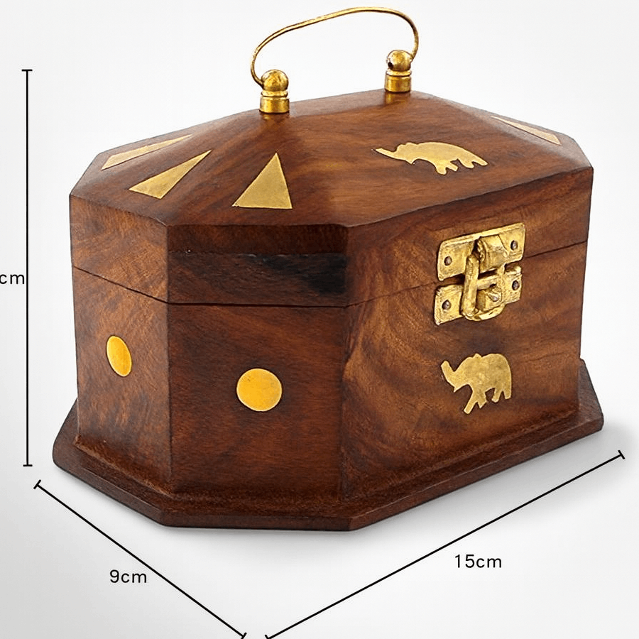 Bring home the charm of Indian craftsmanship with the Klaasy Handcrafted Octagonal Jewelry Box, made from premium quality sesame wood and elegantly decorated with brass inlay work. The unique eight-sided design symbolizes prosperity and balance, while the golden elephant and geometric motifs add a royal touch of tradition.