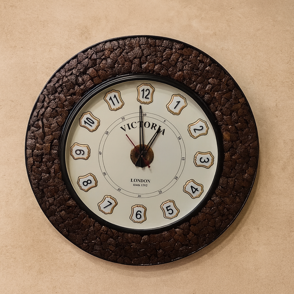 Enhance your home décor with timeless elegance using the Victoria London Handcrafted Wall Clock. Beautifully designed with a premium textured wooden frame and a classic white dial, this clock exudes sophistication and charm. The raised 3D numerals with golden borders and the fine detailing on the outer rim reflect expert craftsmanship and vintage appeal.