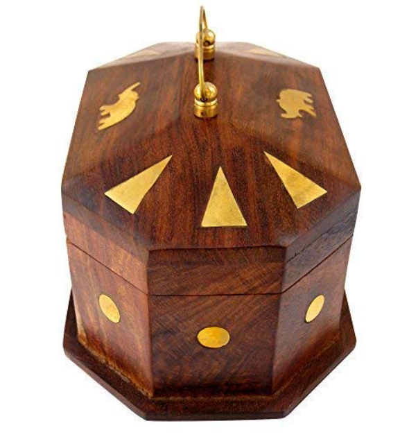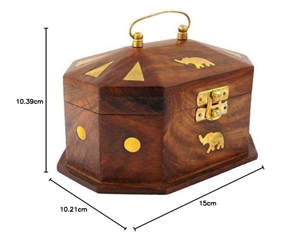 The Klaasy Handcrafted Wooden Jewellery Box is a beautifully designed storage piece made from premium Sheesham wood, known for its natural grain and long-lasting quality. This hexagonal box features exquisite brass inlay artwork, including traditional motifs and geometric patterns, making it a luxurious addition to your dressing table.