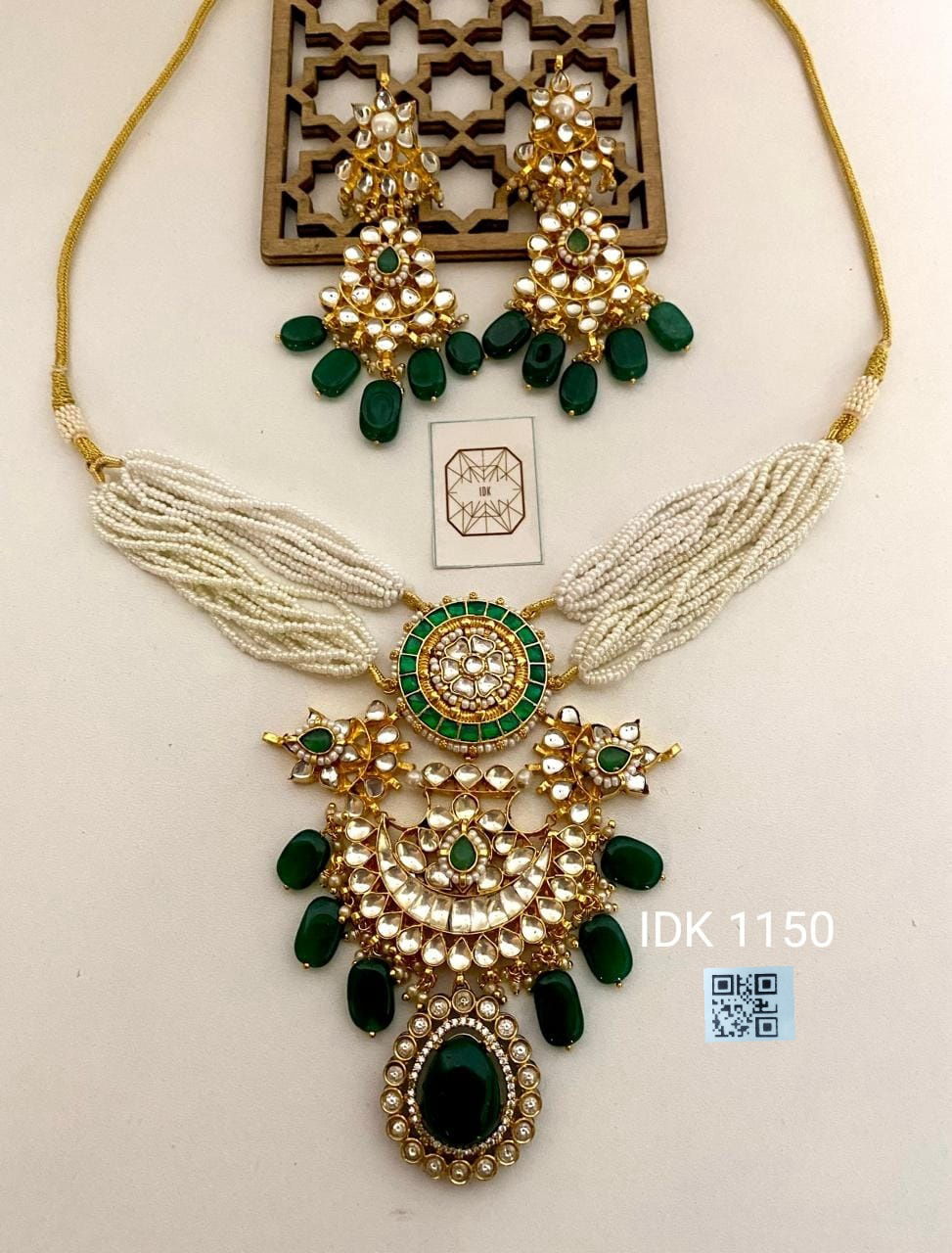 An exquisite necklace set crafted with classic kundan work, layered pearl strands, and rich emerald-green stone accents. Designed to exude royal elegance, this piece is perfect for weddings, festive occasions, and statement ethnic looks.
