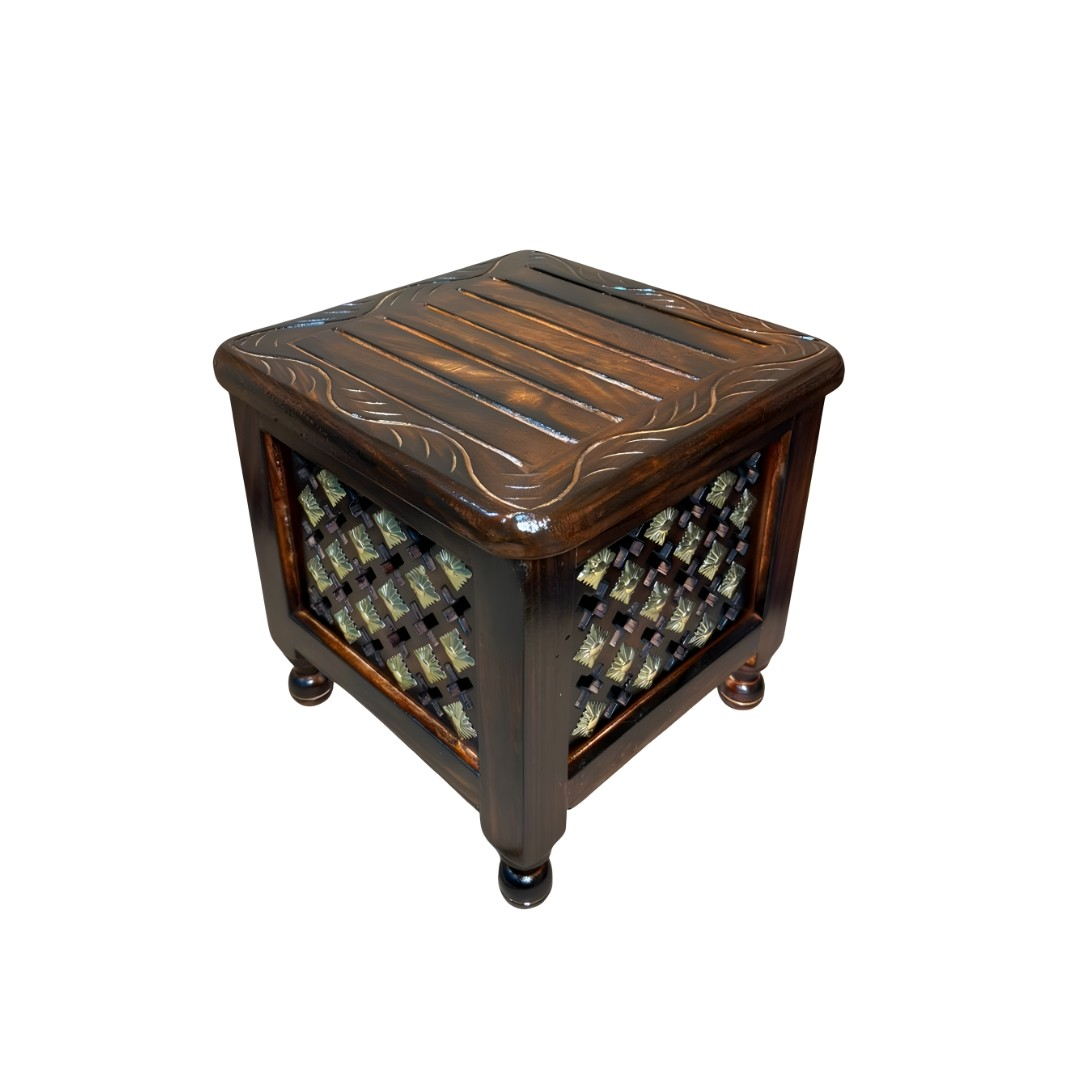 This Handcrafted Wooden Side Table is a compact yet elegant furniture piece, designed to blend functionality with traditional craftsmanship. Made from solid wood, it features a beautifully detailed brass-studded jaali-style front panel and a smooth carved tabletop.