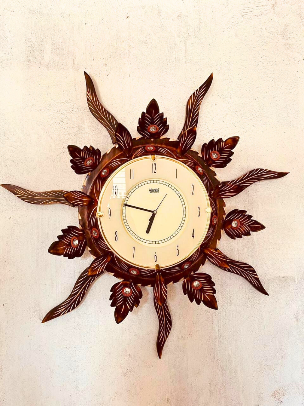 The circular clock face is surrounded by finely carved leaf elements, giving it a striking, sunburst-style appearance. Perfect for living rooms, bedrooms, hallways, or offices, this decorative wall clock adds warmth, elegance, and a handcrafted charm to any space.