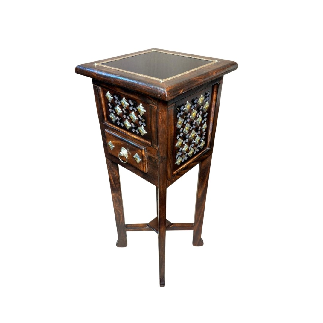 Add timeless charm to your space with this handcrafted wooden side table, thoughtfully designed with traditional brass detailing and a functional storage drawer. Made from solid wood, the table features a rich natural finish, elegant proportions, and sturdy legs that ensure durability and balance.