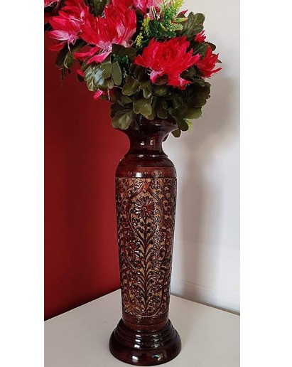 The deep natural wood finish enhances the detailed carvings, making it a striking accent for both classic and contemporary interiors. Its tall, elegant form makes it ideal for floor placement, console styling, or corner décor. Use it as a standalone statement piece or pair it with artificial or dry floral arrangements.