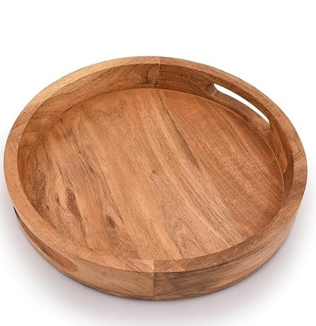 This Handcrafted Round Wooden Serving Tray is designed for effortless serving with timeless appeal. Made from solid natural wood, the tray features a smooth circular profile and integrated cut-out handles for easy grip and movement.
